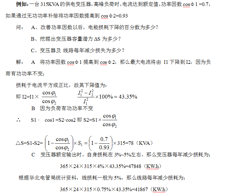 変圧器やラインの容量が不十分な場合は、無効電力補償装置を設置する方法を使用することができます。無効電力補償装置を設置することで、無効電力を局所的にバランスさせ、ラインやトランスを流す電流を低減し、ワイヤやトランス絶縁体の老化速度を遅らせ、耐用寿命を延ばすことができます。同時に、変圧器やラインの容量を解放し、その荷重搬送能力を高めることができます。例えば、 100 KVA の変圧器が現在 85% の負荷で稼働し、 COS Φ が 0.7 である場合、無効電力補償装置を設置することで、変圧器の負荷持ち能力を 30% 増加させることができます。生産能力を増強することなく負荷を増やすことができ、さらなる生産拡大を容易にします。