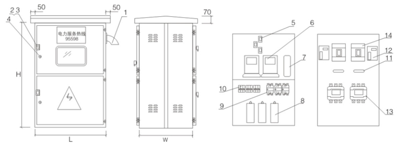 1.パイプ 2 、ドアロック ( オープンロック ) 3 、ドアロックレインボックス 4 、ドアロック ( 隠されたロック ) 5 、電流変圧器 6 、メートル 7 、ジャンクションボックス 8 、コンデンサ 9 、スイッチング溶融接触器 10 、小型遮断器 11 、絶縁スイッチ 12 、ゼロシーケンス変圧器 13 、漏れ電流遮断器 14 、出力 AC 接触器 15 、出力空気スイッチを介したインレットケーブル